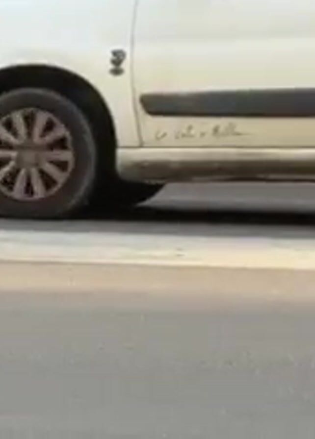 street scene with parked vehicles and a storefront. Several cars pass by, including a white Toyota, a white Peugeot, a silver Kia, and a white Honda. The storefront has a display window and a brick exterior. The road is asphalt and has a painted curb with red and white sections. The scene appears to be during daylight.