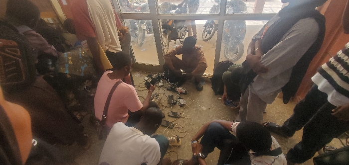 The image displays an indoor scene in Minna, Nigeria, where approximately ten individuals are gathered. The setting features a light-colored floor and a large glass window or door, through which several motorcycles are visible parked outdoors. Centrally arranged on the floor is an assembly of at least ten mobile phones, numerous charging cables, and multiple power banks. Several individuals are seated or crouched around this electronic setup, their focus directed downwards. One person in an orange-brown outfit is positioned in a crouch near the window. Another individual in a pink shirt and a third in a white shirt are actively engaged with the devices on the floor. Additional individuals are standing or partially visible within the frame, observing the activity. The collective action indicates the charging and management of personal electronic devices.