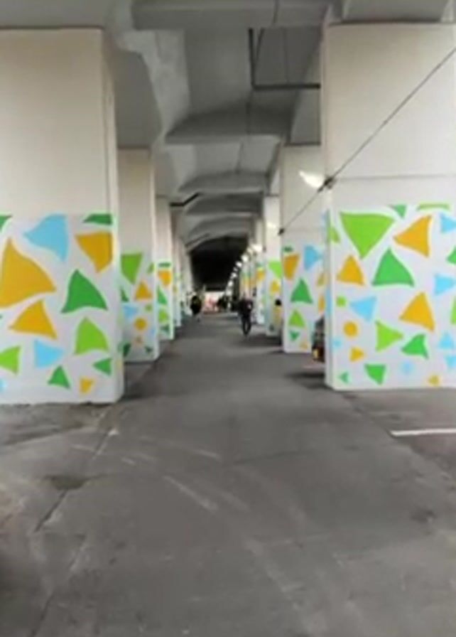 covered walkway under an elevated structure, with a gray asphalt surface and white support columns decorated with colorful geometric shapes