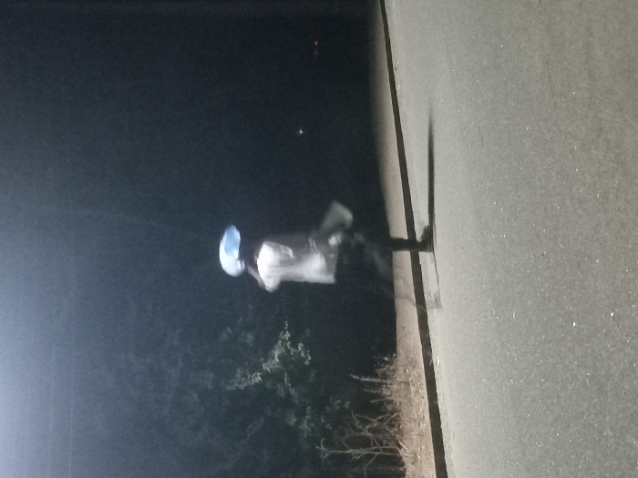A poorly lit night scene shows a person holding a circular object, perhaps a plate, in front of them. The person is blurry, wearing a light-colored shirt and dark pants. They stand near some bushes. To the right is a concrete or asphalt surface with a distinct edge, casting a shadow perpendicular to the edge. The overall image has a blurry, low-quality feel, making details difficult to discern.