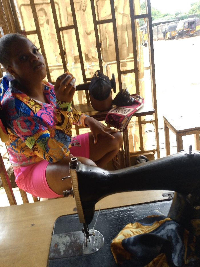 A woman is seated at a sewing machine with fabric underneath the needle. She wears a colorful patterned shirt and pink shorts. Behind her is a barred window, with a shelf holding a black hat and other items. Outside the window, auto rickshaws are visible. The space appears to be a small tailoring shop. The woman is looking upwards and holding something in her hand near her face. There are suit-like images displayed as decorations, likely as examples of clothing that can be tailored.