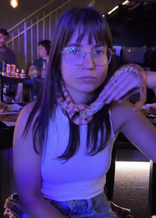 A woman with shoulder-length brown hair, wearing clear-framed glasses, a white tank top, and blue jeans, is sitting in a bar or restaurant with a snake draped around her neck and shoulder