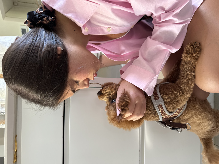 An indoor scene in Rishon LeZion, Israel, shows a close-up of a female individual interacting with a small dog. The female, visible from the mid-torso upwards, has dark hair pulled back with a black and leopard-print scrunchie. She wears a light pink collared shirt, a small ear stud, and pink nail polish. Her hands gently cup the face of a small, curly-haired brown dog, resembling a poodle, which is wearing a brown and tan patterned harness. The dog is standing on its hind legs, looking up at the female. The female is leaning forward, her lips slightly puckered towards the dog. The background consists of white, minimalist furniture, possibly a dresser or cabinet, with a white wall, suggesting a domestic interior.