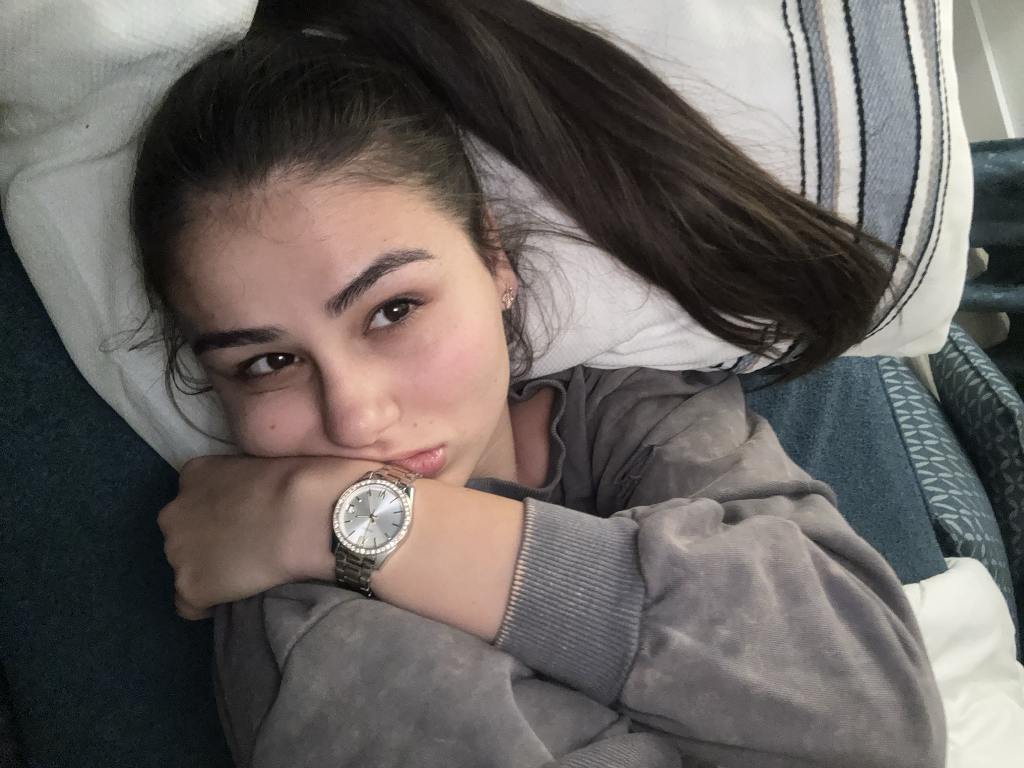 A young woman with dark hair pulled back in a high ponytail is lying down. She is resting on a white pillow, with a striped pillow behind her. She is wearing a gray sweatshirt and a silver wristwatch. Her left arm is bent, with her hand near her face. The location is likely indoors. There is no discernible evidence in the image to confirm the location is in Harmanli, Bulgaria.
