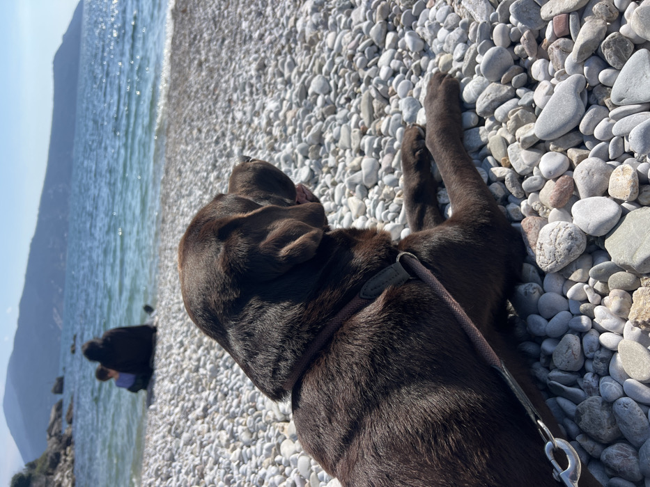 A dark brown Labrador Retriever dog is lying in the foreground on a pebble beach in Herceg Novi, Montenegro