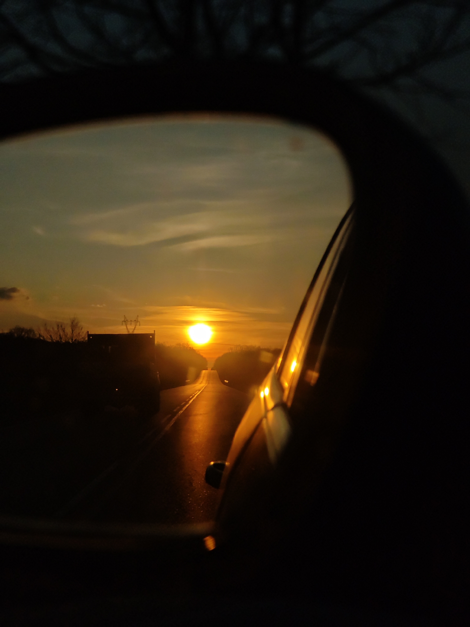 The image depicts a sunset seen through a car's side mirror