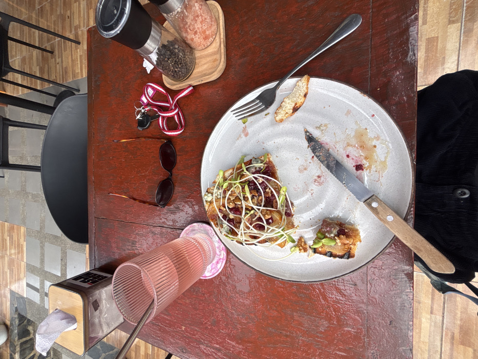 An overhead view depicts a reddish-brown wooden table in an outdoor or semi-outdoor setting in Koh Tao, Thailand; the specific establishment is not discernible from the image. A partially consumed meal occupies a light-colored ceramic plate with a darker rim. The central food item is a slice of toast topped with a dark red spread, blue cheese crumbles, walnuts, and green sprouts. A smaller, severed portion of this dish is positioned on the lower left of the plate, adorned with green pistachios. A small, plain piece of toasted bread lies on the upper right. A metal fork is on the right side of the plate, and a serrated knife with a light wooden handle rests on the lower center, amidst scattered food remnants and a red liquid residue. To the upper left, a wooden-topped tissue box containing white tissues is present. Adjacent to the plate on the left is a tall, ribbed, pink-tinted glass containing a light pink liquid and a metal straw, situated on a round, pink marble-patterned coaster. To the right of the glass, folded tortoiseshell sunglasses and a set of keys on a red and white striped lanyard are placed on the table. On the far right, a small wooden tray holds two clear cylindrical grinders, one filled with black peppercorns and the other with pink Himalayan salt. The background features a tiled floor with alternating light grey and darker grey square tiles, along with portions of dark, minimalist chairs. The lap of an individual, dressed in dark clothing, is visible at the bottom of the frame, indicating a seated person.