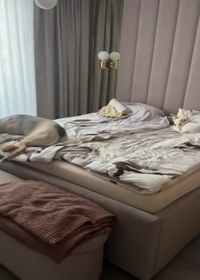 bedroom with two dogs relaxing on a bed. One dog, light brown with gray fur on its back, is lying on its side near the edge of the bed, facing a window covered with sheer, light-colored curtains. The other dog, white, is curled up on the opposite side of the bed, near the headboard. The bed has a patterned comforter and is against a padded headboard that matches the color of the bed frame. An ottoman, covered in a light tan fabric, sits at the foot of the bed, with a folded brown blanket on top. A wall with a light pink color is behind the headboard with a unique light fixture on it.