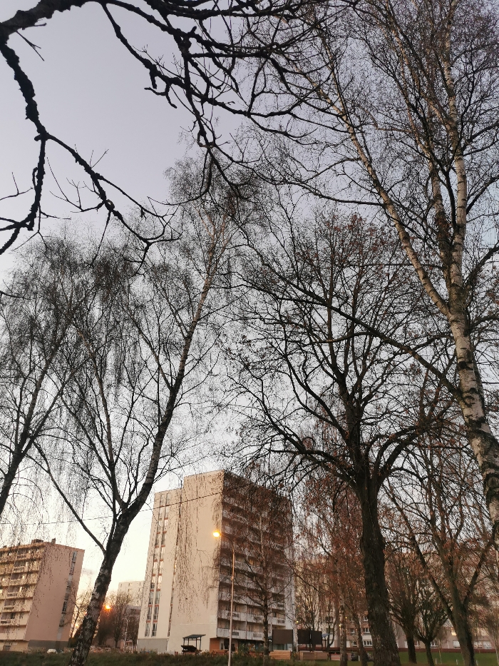 Tall, bare trees dominate the foreground, their branches silhouetted against a pale sky. Behind them are apartment buildings, mostly white or light-colored, with multiple stories and visible balconies. A few streetlights glow softly. The scene is bathed in a soft, possibly early morning, light, giving a muted, almost dreamlike, quality to the urban landscape.