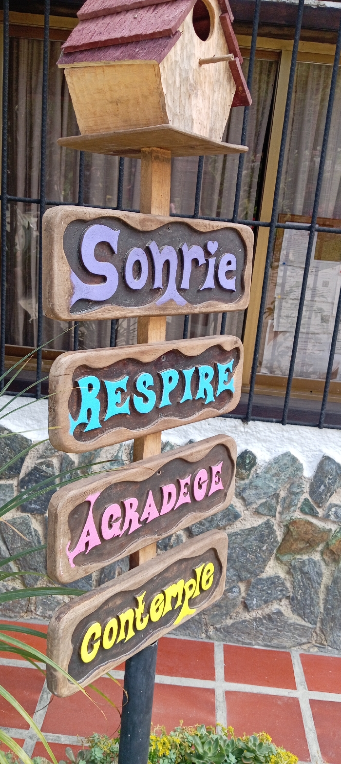 A wooden signpost stands outdoors in Colonia Tovar, Venezuela. Atop the signpost is a wooden birdhouse with a reddish-brown shingled roof, a circular entrance hole, and a small perch. Below the birdhouse, four horizontally oriented, carved wooden signs are stacked vertically on the central wooden post. Each sign has a light wood frame and a dark recessed area containing raised, brightly colored Spanish words. From top to bottom, the signs read: "Sonríe" (Smile) in light purple, "Respira" (Breathe) in light blue, "Agradece" (Give thanks/Appreciate) in pink, and "Contemple" (Contemplate/Behold) in yellow. The wooden post transitions to a black metal pole at its base. In the background, a building's window with vertical and horizontal black metal security bars is visible. Light-colored, semi-transparent curtains are drawn behind the window. To the right of the signpost and below the window, a wall constructed from irregular grey and dark stones with light mortar is present, topped by a white painted section. The foreground features reddish-brown terracotta floor tiles arranged in a grid pattern with light grout, and various green plants including spiky foliage, succulents, and low-growing vegetation with small yellow flowers. No people are visible in the scene.