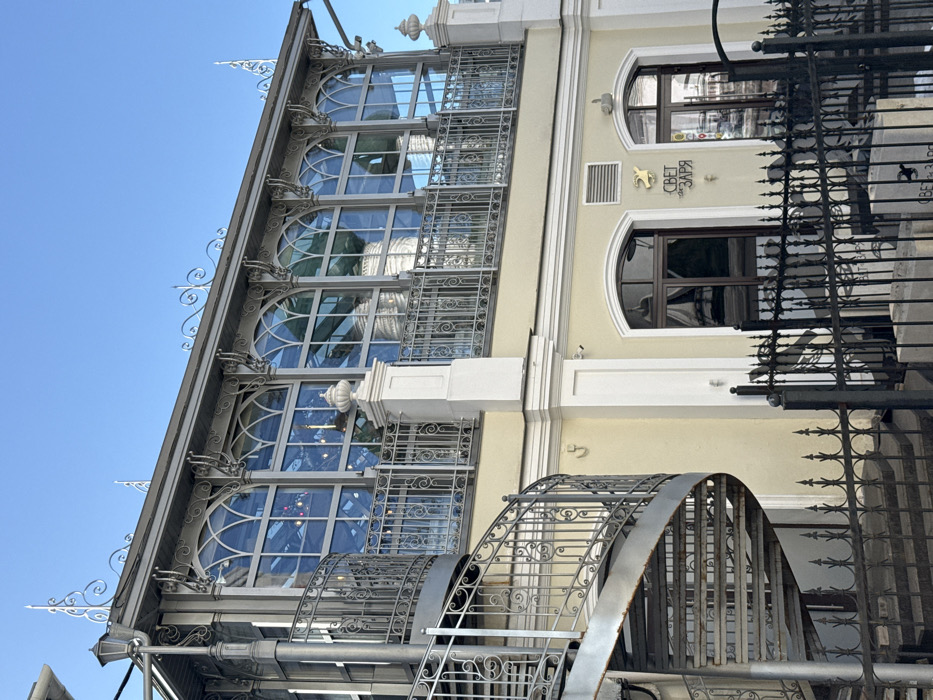 A two-story building facade, rendered in a light yellow/cream color with white trim, is depicted under a clear blue sky. On the left, a grey metallic spiral staircase with an ornate railing ascends to the second level. The upper level features an enclosed veranda or sunroom, characterized by a series of six arched windows with dark metal frames, each topped by decorative scrolled metalwork. A corresponding dark metal railing with intricate balusters runs along the front of this upper level, supported by white pedestals. Ornate metal scrollwork also adorns the roofline above the veranda. The ground level of the building presents two arched doorways or windows with dark frames. Between these features, a horizontal vent is visible, and a gilded sign reading "СВЕТ ЗАРЯ" (Svet Zarya) is affixed to the facade. A dark, ornate metal fence partially obstructs the lower section of the building, behind which several concrete blocks also marked "СВЕТ ЗАРЯ" are present. A grey metal lamp post is integrated into the structure near the top of the spiral staircase on the far left. The glass windows reflect the blue sky and interior elements. No individuals are visible within the scene. The location is in the city of Rusanovo, Russia.