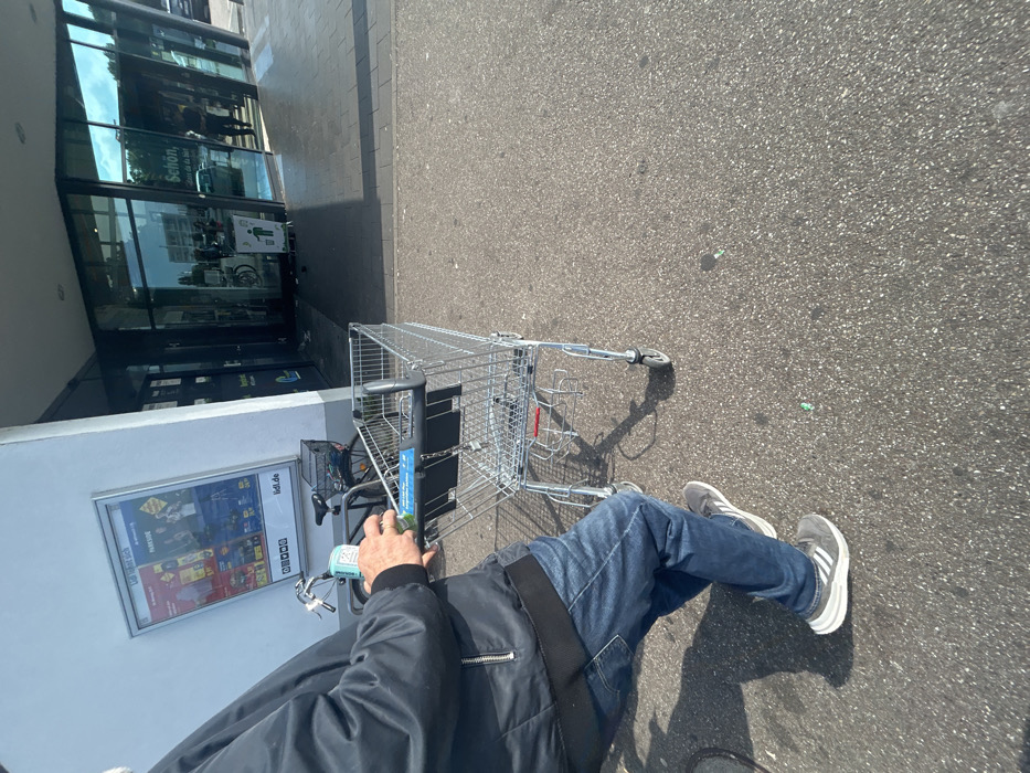 The image displays an outdoor scene in front of a Lidl supermarket located in Kehl, Germany, observed under bright daylight. A person, partially visible from the mid-torso down on the left side of the frame, is pushing a silver-colored metal shopping cart with a black handle. The individual is wearing a dark, possibly black, bomber-style jacket, blue jeans, and grey athletic shoes with white stripes (Adidas brand). The shopping cart features a blue informational panel on its handle and has a coin-operated lock with a key attached. To the left of the main entrance, a large advertising poster for "Lidl" and the "PARKSIDE" brand is affixed to a white exterior wall. A bicycle with a black front basket is parked against this wall, partially obscured by the person and shopping cart. The supermarket entrance consists of large glass panels, reflecting the sky, trees, and a distant vehicle, indicating a street or parking area. A reflection of the German text "Schön, dass du da bist" ("Nice that you're here") is visible on one of the glass panels. A small green and white sign with a recycling symbol is positioned near the entrance doors. Two pigeons are situated on the darker paved area directly in front of the glass doors. The immediate foreground consists of a grey asphalt surface, on which small green fragments of debris are scattered.