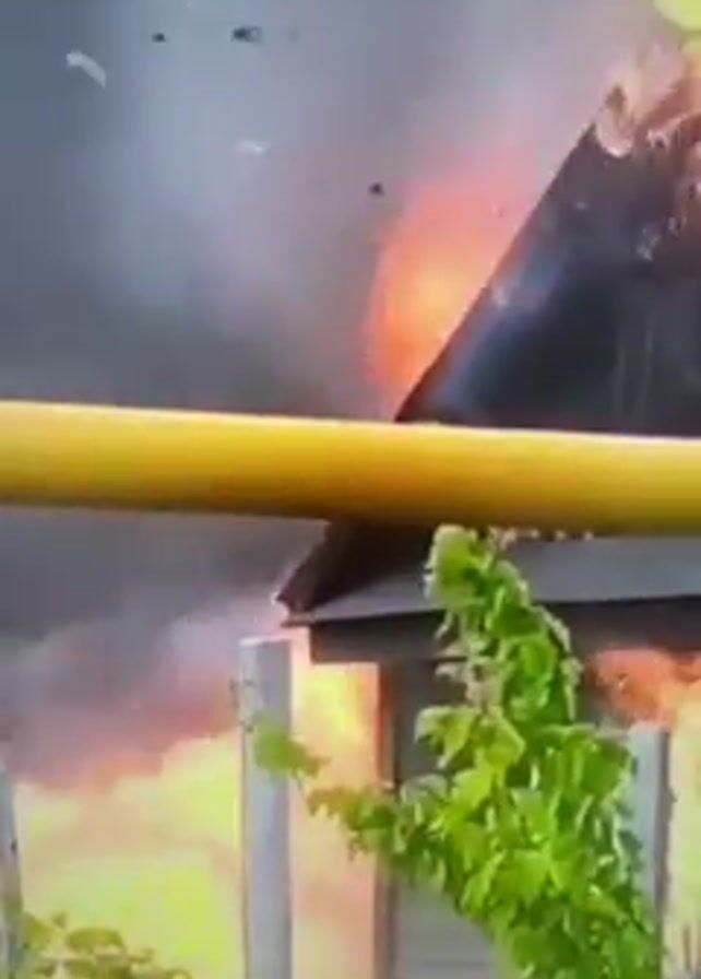 The video depicts a house engulfed in flames. The fire is intense, with large flames visible through the structure's openings and rising above the roof. Thick, dark smoke billows into the sky, obscuring the scene. A yellow pipe runs horizontally across the foreground, partially obstructing the view of the burning house. In the immediate foreground, there is a white picket fence with green foliage growing behind it. The overall scene suggests a devastating house fire.