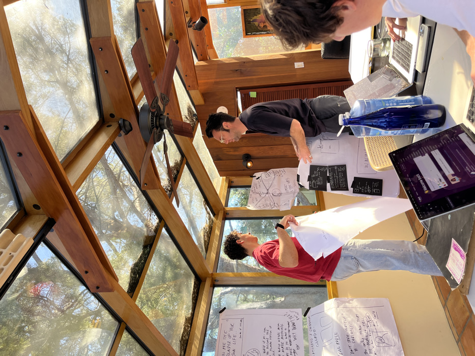 Three people are collaborating on a project in a room with a unique glass structure and wooden beams. One person wears a red shirt and holds a large sheet of paper, another wears a black shirt and glasses, and the third person is seen typing on a laptop. Various sheets of paper with handwritten notes and diagrams are spread across a table, alongside a laptop, a tablet, and large bottles of water. The room is filled with natural light, casting shadows and highlighting the wooden architecture.