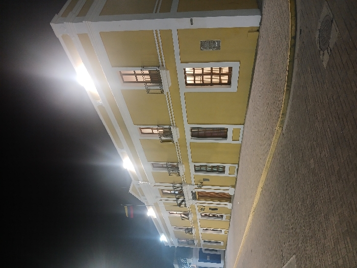 A long, yellow building with white trim stands illuminated at night. Several windows with decorative balconies are visible along the facade. A street paved with stones runs alongside the building. Streetlights cause bright flares in the image. A flag hangs from the building's lower section. A manhole cover is visible on the edge of the street.