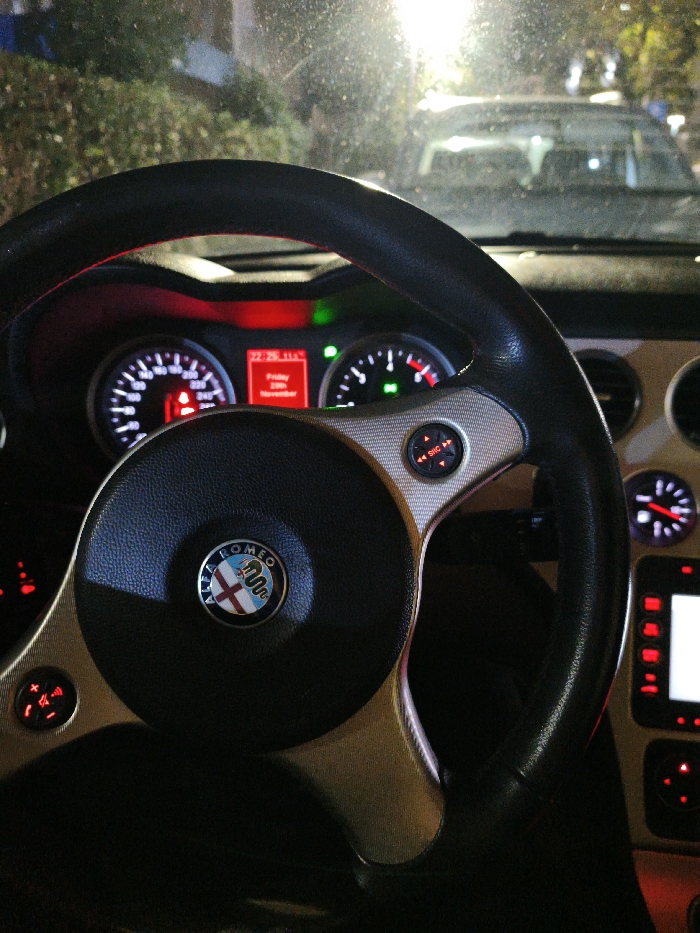 The photo shows the interior of a car, focusing on the steering wheel. The steering wheel has an Alfa Romeo logo in the center, with audio control buttons on both sides. The dashboard behind the steering wheel is visible, including the instrument cluster and a digital display showing the date and time as Friday, November 20th at 22:25. Through the windshield, another vehicle is visible.