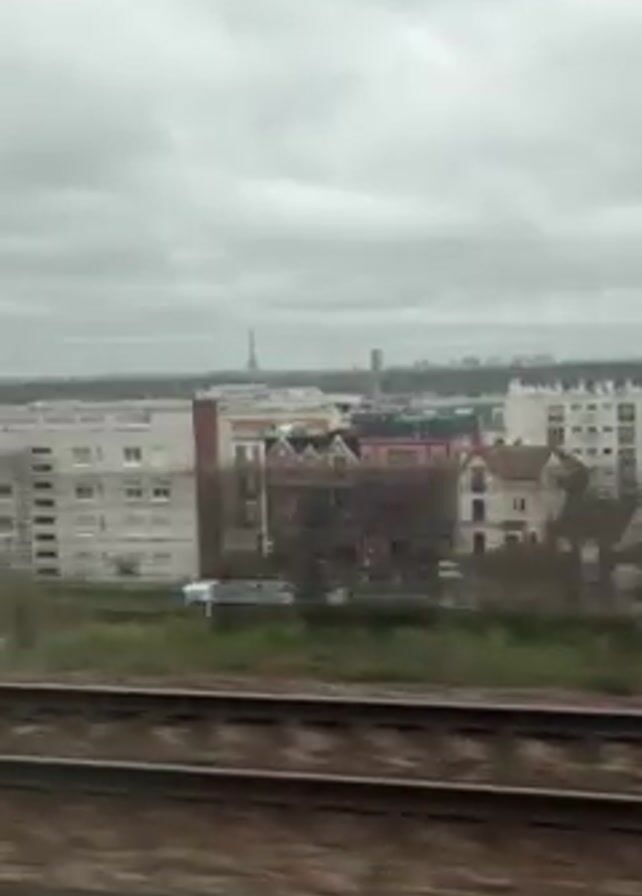 The video depicts a view from a moving train. The foreground shows the train tracks. In the midground is a city landscape with various buildings, including residential apartments and houses. The Eiffel Tower is visible in the distance, along with other taller structures on the horizon. The sky is overcast with a layer of gray clouds.
