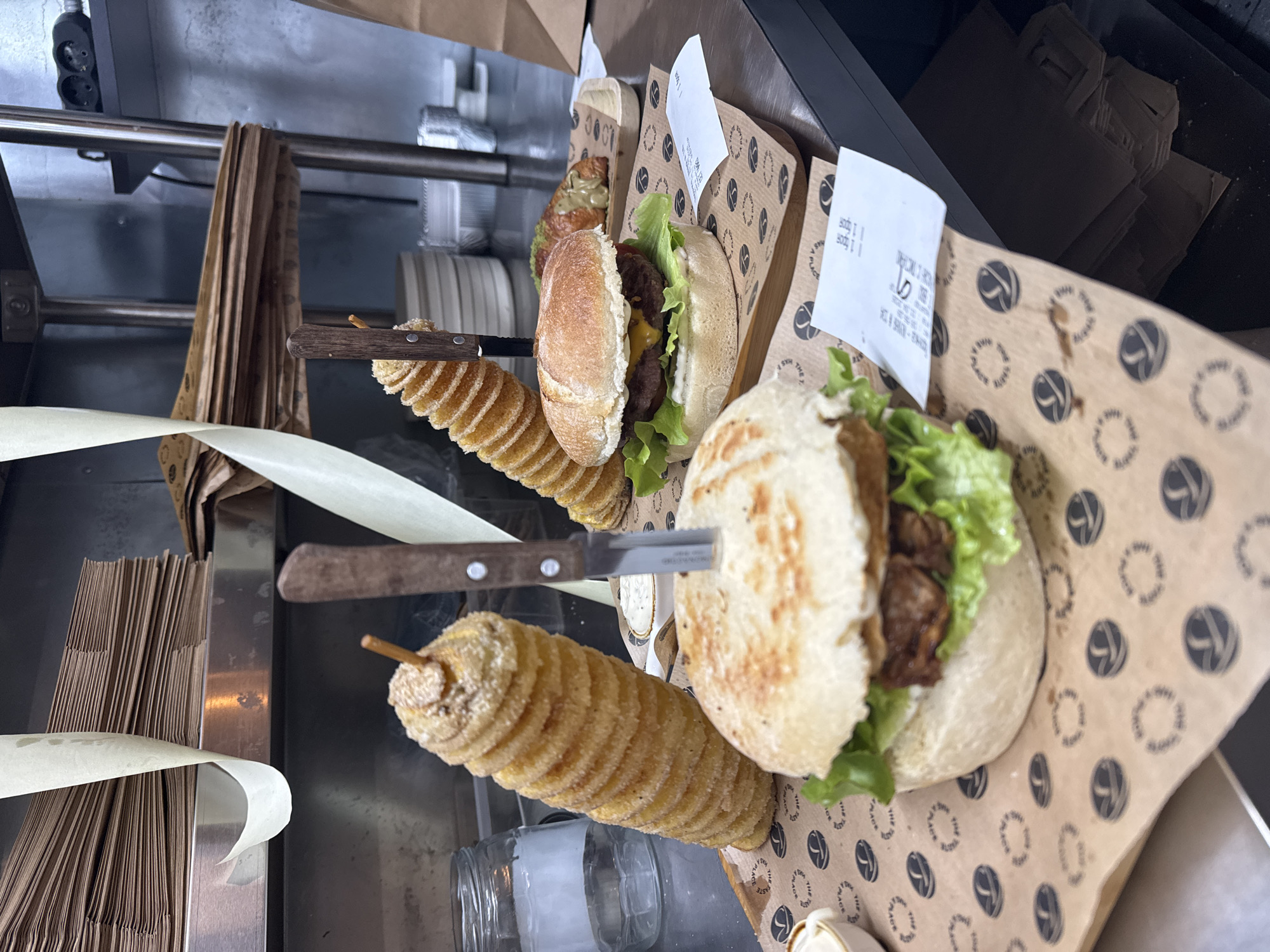 The image depicts a culinary scene in an unidentified city. Two hamburgers, each pierced by a knife, rest on brown paper printed with a circular logo, beside two tornado potatoes, also pierced by knives. One hamburger contains a beef patty, cheese, and lettuce between a glazed bun. The other contains what appears to be a different protein filling and lettuce in a lightly colored bun. The tornado potatoes appear golden brown and crispy. The setting includes stacks of brown paper bags, dispensing tape, and a stainless steel countertop. The presence of the knives suggests a deliberate presentation or preparation setting.