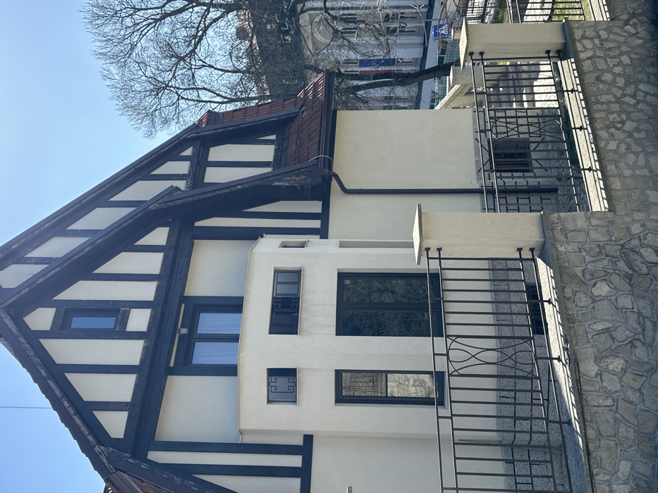 The image displays the facade of a multi-story building in Bankya, Bulgaria, under bright daylight. The structure features a prominent steeply pitched roof with red-brown tiles and exposed dark brown timber beams contrasting with cream-colored stucco walls, indicative of a Tudor Revival architectural style. The main facade visible includes a large gable section. On the upper floor, a central window with two dark framed panes is positioned beneath the roof peak. Below this, a set of dark-framed double doors or large windows are recessed into the wall. Protruding from the main facade on the lower levels is a cream-colored rectangular extension or balcony structure. This extension features two upper rectangular windows with decorative dark metal grates, one on the left with a geometric pattern and one on the right with a similar pattern. Below these, two larger dark-framed windows are present; the left one is taller and narrower, while the right one is wider. A dark downspout runs vertically along the right side of the building. In the foreground, a dark metal fence with vertical bars and some decorative scrollwork is visible, set atop a low wall constructed from irregularly shaped light-colored stones. The fence includes several cream-colored square concrete posts at intervals. Shadows from the fence and posts are cast onto the stone wall and ground, indicating a high sun position. Beyond the building to the right, leafless deciduous trees are visible against a clear blue sky. Further in the background, a lighter-colored building with arched windows and decorative architectural elements can be seen, partially obscured by the trees. Flags, including a Bulgarian flag, are visible hanging from poles near this background building. A street or walkway with a blue pedestrian crossing sign is also visible in the distance to the lower right. No individuals are present in the scene.