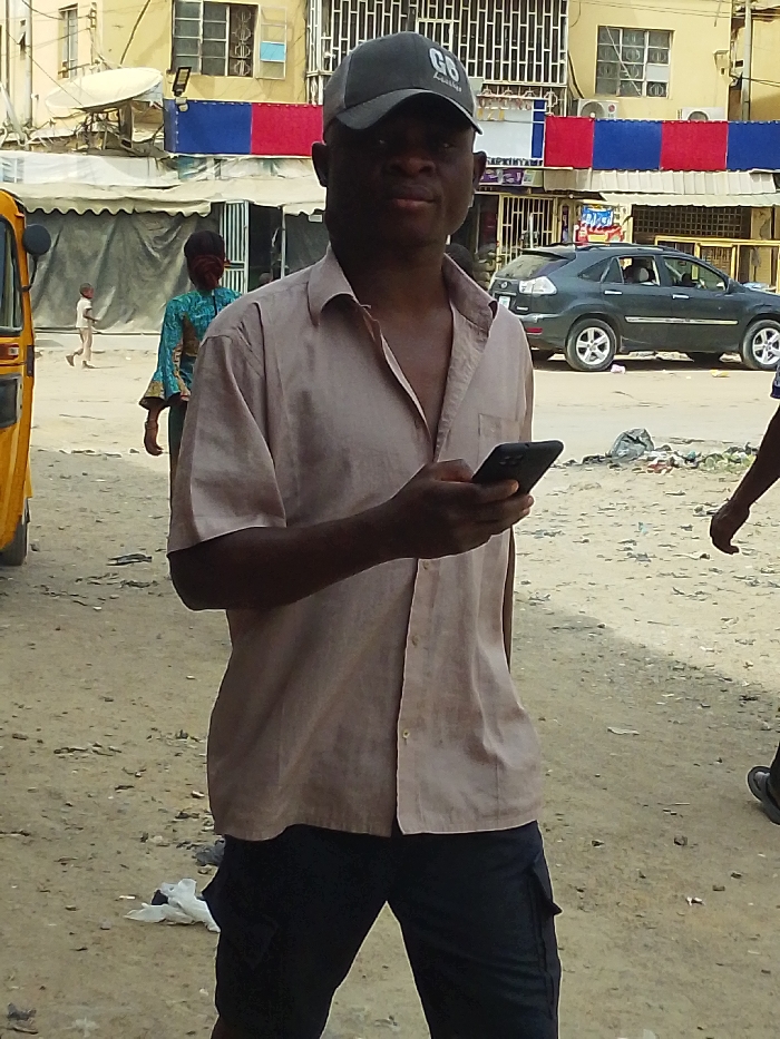 The image depicts an unpaved urban street scene in Sabon Gari East, Nigeria. In the foreground, a dark-skinned male stands centrally, looking directly at the camera. He wears a grey baseball cap with a white "GO" logo, a light brown short-sleeved button-up shirt unbuttoned at the collar, and dark cargo shorts. He holds a black smartphone horizontally in his left hand. In the midground, behind the primary subject: - To the left, a yellow three-wheeled auto-rickshaw is partially visible. - A person with dark hair, wearing a patterned blue and green garment, walks away from the camera. - Further left, a small child in a white shirt walks away from the camera. - To the right, a dark-colored SUV, possibly a Lexus RX, is parked or in motion. - On the far right, the lower leg and foot of another individual, wearing a dark shoe, are visible. The environment includes: - A dirt ground surface littered with scattered refuse, including black plastic bags. - A row of shops or stalls behind the midground figures, featuring various awnings, including one with blue and red stripes. - A multi-story building forms the backdrop, displaying numerous windows with grates, a white satellite dish, and air conditioning units on its facade. A street light or camera is mounted on a pole near the satellite dish.