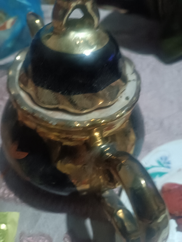 A close-up shows a partially visible, ornate teapot. Its handle is gleaming gold, as is the trim around the lid. The lid's upper portion is a dark, possibly black, material with a reflective sheen. The body of the teapot is a combination of the dark material and gold accents. Some surrounding objects and surfaces are slightly out of focus.