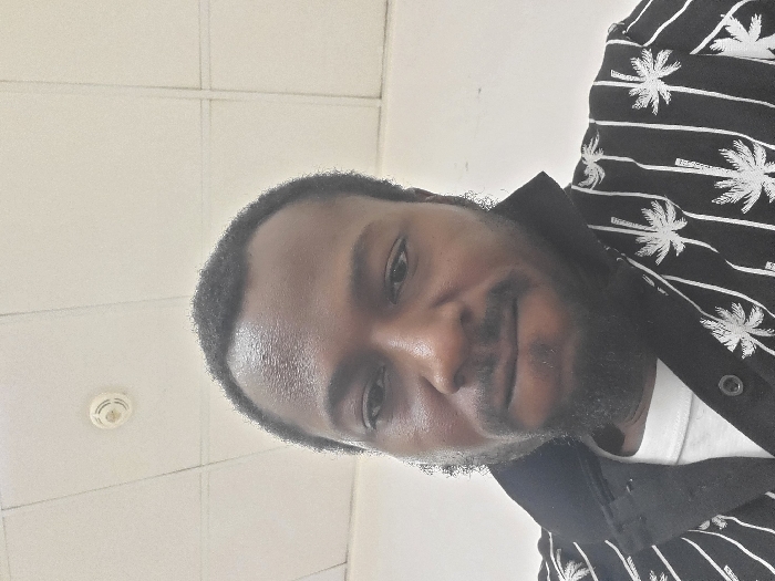 A close-up image depicts one adult male with dark skin, short dark hair, and a dark beard and mustache, whose forehead appears slightly reflective