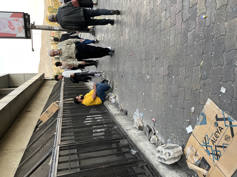 This image displays an outdoor urban scene on a paved sidewalk in Al-Qanawat Municipality, Syria. A man with a dark beard, wearing a yellow t-shirt and blue jeans, is seated on a concrete ledge against a light grey building wall, which is partially covered by dark metal security grates. He holds a clear plastic bottle in his left hand and has a yellow object in his mouth. Above him, a brown cardboard box with Arabic text is propped diagonally on the security grates. To the seated man's right, a young man with dark hair, wearing a white t-shirt and light grey pants, stands holding a black jacket over his left arm, looking towards the seated man. In the mid-ground, an older man with grey hair and glasses, dressed in a tan long-sleeved shirt and dark trousers, walks towards the viewer on the interlocking paver sidewalk. Several other pedestrians are visible in the background, moving along the sidewalk. The sidewalk is littered with various debris, including plastic bags, wrappers, small paper scraps, and broken concrete fragments. In the immediate foreground, a flattened brown cardboard box with "GROUP ALEYA" printed in blue text lies on the pavers. Near the base of the wall, there is a weathered, hollow cylindrical stone object and additional rubble. A black street pole with a backlit billboard advertising "Can" (featuring pink floral designs) is visible on the right side of the image. Distant mountains are visible under a bright sky in the background, beyond the urban structures.