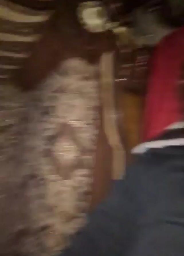 The video starts with a close-up, blurry shot of a person's face, seemingly lying down. The person has fair skin and curly hair. They are wearing a dark-colored shirt. The camera is shaky. It then pans upwards to show part of a patterned chair or sofa. The background is out of focus and dark.