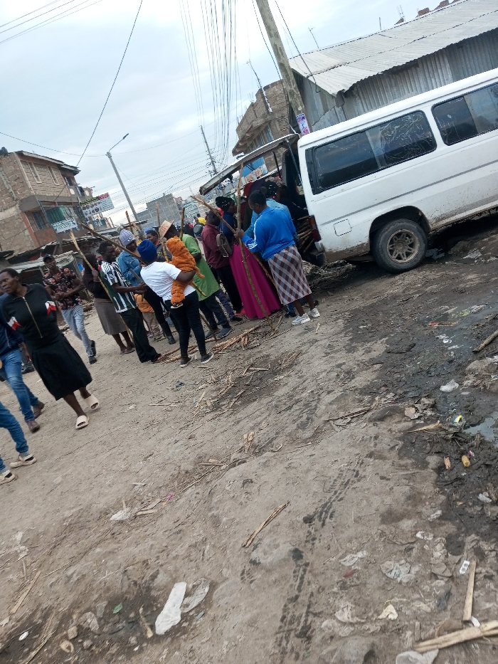 The image captures an unpaved street in the Syokimau-Mulolongo ward, Kenya, under an overcast sky. Approximately 15-20 individuals, mainly adults, are visible. Many are carrying wooden sticks or poles. A woman in a white t-shirt and dark pants holds a child dressed in an orange outfit. The group is gathered near a stationary white passenger van, likely a matatu or minibus, positioned partially off the dirt road on the right side. The van exhibits visible dirt on its lower body and wheels. The ground is an uneven dirt surface, characterized by muddy patches, shallow puddles, tire tracks, and scattered refuse including plastic bags, paper, and organic debris. Fragments of broken wooden sticks are also present on the ground. Multi-story buildings, some with corrugated iron roofs, line both sides of the street, featuring distant commercial signage. A prominent utility pole with numerous overhead wires and a streetlight are visible further down the road. The scene suggests a collective gathering or movement on a busy, unmaintained thoroughfare.