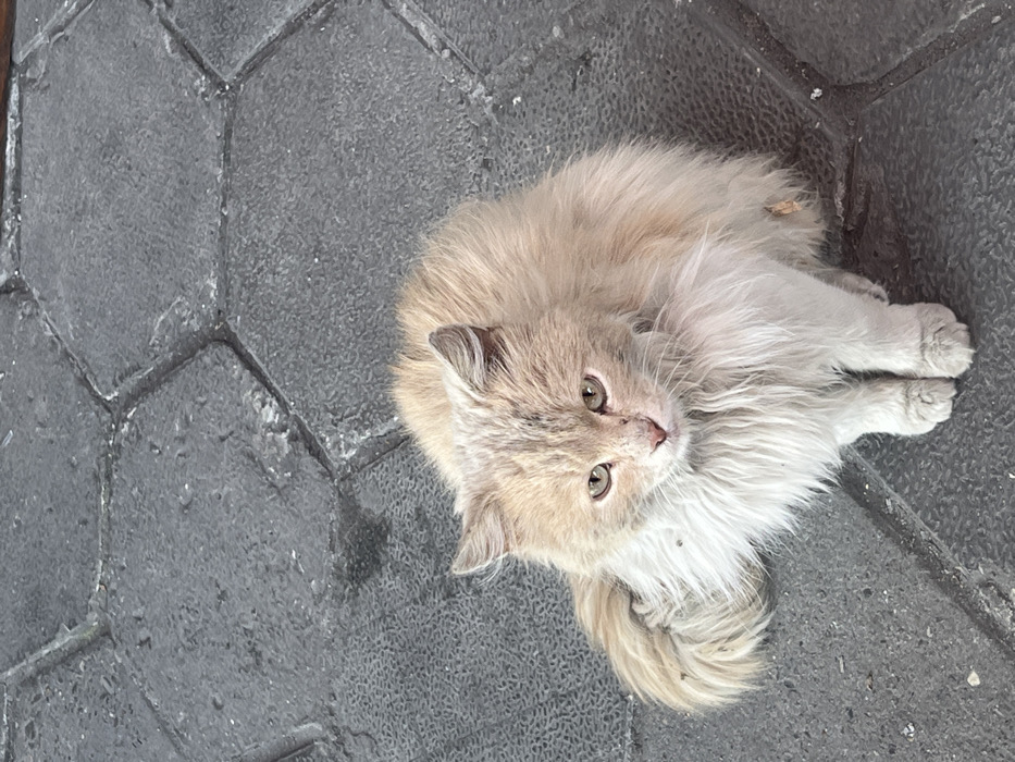 A long-haired domestic cat is depicted sitting on a paved surface in Balgarski Izvor, Bulgaria. The cat has a cream and white coat, with cream/light orange fur on its head, back, and upper flanks, and white fur on its chest, belly, and legs. Its fur appears somewhat matted and unkempt, with minor discoloration around its nose. The cat's light-colored eyes, possibly amber or green, are directed forward towards the viewer. It is positioned with its front paws together and its tail curled to its left side. The ground beneath the cat consists of dark grey, hexagonal interlocking pavers, which show some minor surface imperfections and light-colored debris. The scene is illuminated by natural light, and no other subjects or objects are visible in the immediate environment. The cat is stationary, exhibiting no active movement or interaction.
