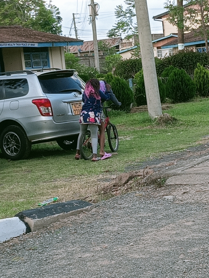 A person with pink-tipped hair stands next to a bicycle, appearing to adjust it, on a grassy area next to a silver car. The car's license plate is partially visible. A low concrete barrier separates the grass from a gravel path. Buildings and trees form the backdrop, with utility poles and wires visible in the distance.