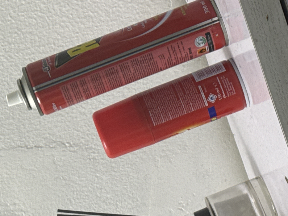 The scene depicts an indoor setting, likely within a dwelling or commercial space in Yenegoa, Nigeria. No people are present. Two red aerosol cans are positioned on a white, reflective horizontal surface. A white, textured wall serves as the background. The larger aerosol can, located on the right side of the frame, is red with a metallic top and a white plastic nozzle. Its label features a prominent black and yellow 'R' logo, with the word "Killer" partially visible above it. Text on the label indicates a volume of "300 ml e" and includes warning symbols for flammability (flame icon) and environmental hazard (tree and fish icon). The smaller aerosol can, positioned to the left of the larger one, is also red and features a matching red cap. Its label indicates a volume of "150 ml e" and includes a flammability warning symbol (flame icon). Text on this can's label also mentions "Made in Germany." To the far left, partially visible, is a clear glass bottle with a black stopper from which several black reeds emerge, consistent with an aroma diffuser. The objects are stationary, with no discernible actions or interactions occurring. The white reflective surface shows clear reflections of the aerosol cans.