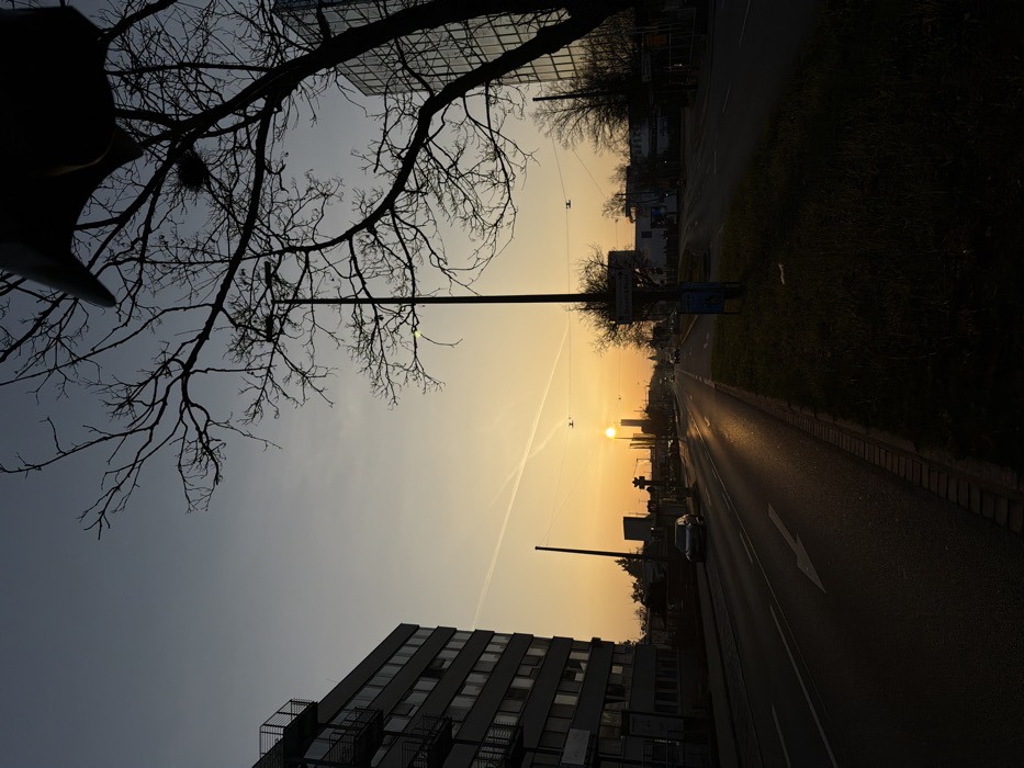 The image presents a wide-angle view of Schwabacher Straße in Fürth, Germany, during either sunrise or sunset. The sun, a bright orange disc, is low on the horizon, positioned slightly right of center, casting long shadows and illuminating the road surface with an orange reflection. The sky above transitions from a pale blue-grey at the zenith to a clear, bright orange-yellow near the horizon, with two distinct white aircraft contrails forming an 'X' shape high overhead. On the left side of the frame, a multi-story building with a dark grey facade and numerous windows occupies the foreground. It features external balconies or fire escapes on its left flank. Adjacent to the building is a paved surface, likely a sidewalk or cycle path. The asphalt road, wet from dew or recent rain, exhibits a distinct white arrow indicating forward travel in the lane closest to the viewer. A dark-colored sedan is visible in this lane, moving away from the camera, with other vehicle silhouettes present further down the road. The right side of the image features a large, leafless deciduous tree in the immediate foreground, its bare branches silhouetted against the sky. A bird's nest is clearly visible within its upper branches. Part of an unidentified dark object or structure partially obscures the extreme top-right corner. A tall street light pole stands on a narrow grassy verge that runs parallel to the road. Attached to a pole within this verge is a blue rectangular informational sign, identifying the location as "Schwabacher Str." and "Fürth". Beyond the foreground tree, parts of a building with a reflective glass facade are visible, along with additional trees and urban infrastructure receding into the distance. No individuals are discernible in the scene.