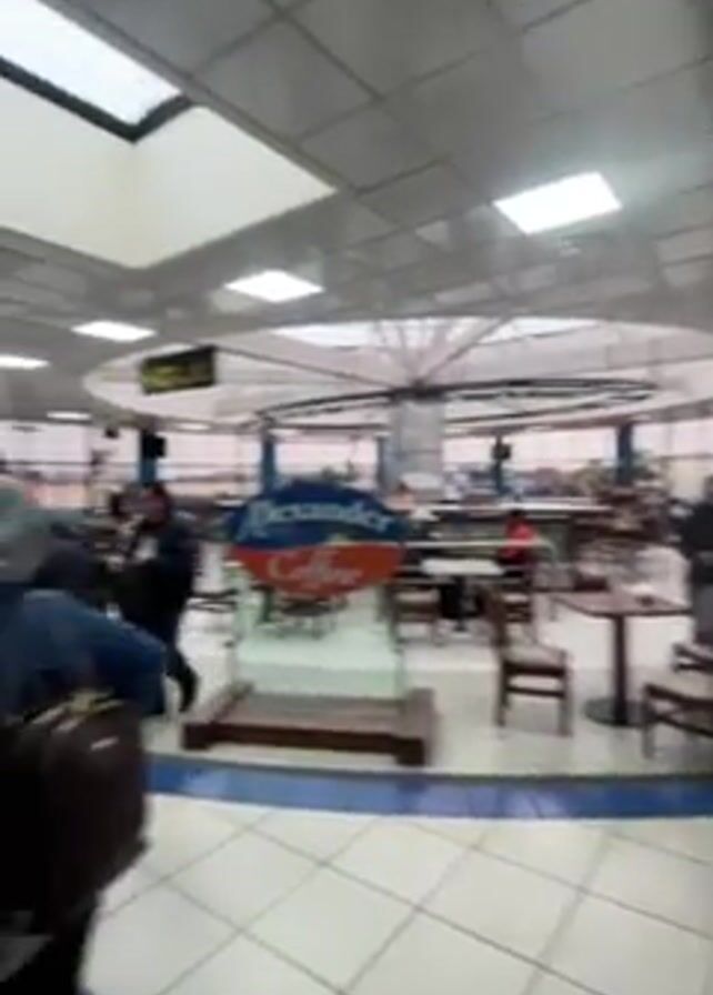 interior of an airport. The first shot is an overview of a dining area with tables and chairs. An "Alexander coffee" sign is visible. The camera moves through a crowd of people, some with luggage. There are directional signs overhead. The environment appears to be an airport terminal. People are walking and talking, likely heading to their departure gates.
