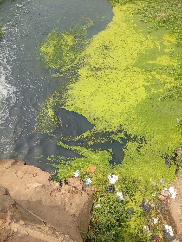 The image displays a section of a water body located in Abuja, Nigeria, viewed from an elevated perspective. The water surface is divided, with the left portion exhibiting dark, murky water, characterized by visible foam and surface agitation indicative of a current. The right side of the water body is extensively covered by a thick, vibrant lime-green layer of aquatic vegetation, likely algae or duckweed, with darker water visible beneath in patches. The foreground on the lower left features a damaged, light brown concrete structure, possibly part of an embankment or bridge support, showing erosion and a rough texture. Adjacent to this concrete structure, along the bank bordering the aquatic vegetation, is an area of green terrestrial growth, consisting of grass and weeds. This bank and the immediate edge of the water are heavily littered with various items of refuse, including multiple white and black plastic bags, plastic wrappers, and other unidentified debris. No individuals or animals are visible within the scene. The overall environment suggests an urban or semi-urban setting with evidence of water pollution and improper waste disposal.