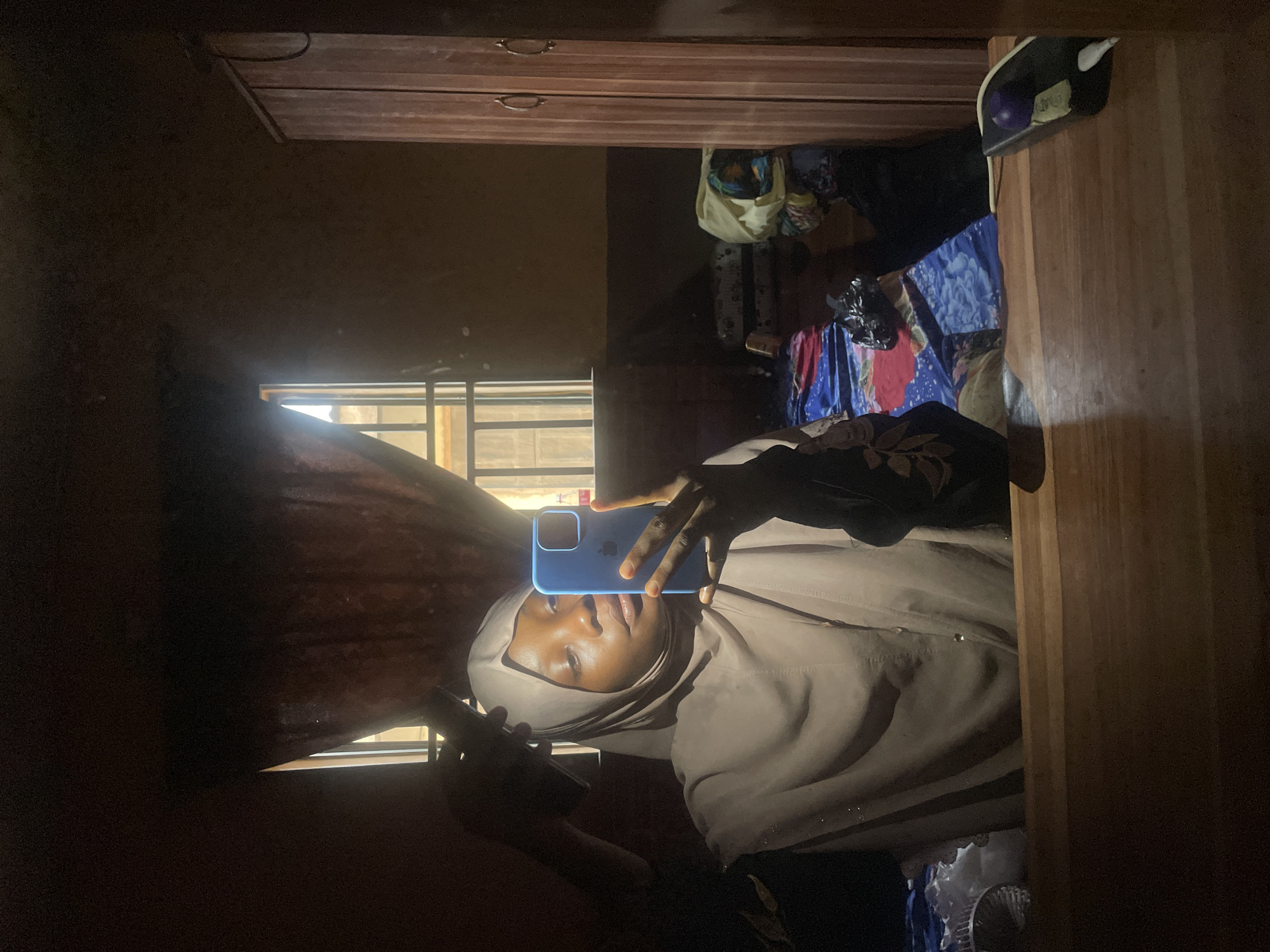 An individual, identified as a young female wearing a light brown hijab and a dark, floral-patterned long-sleeved top, is depicted taking a selfie in a mirror. She holds a light blue smartphone in her right hand, positioned to capture her reflection. The scene is an interior room within a residence in Gwagwalada, Nigeria. Strong natural light enters from a window on the left, which features metal security bars and partially drawn dark red curtains, illuminating the subject's face and parts of the immediate foreground while rendering much of the background in shadow. To the right of the subject, a tall, light brown wooden wardrobe with two handles is visible. Behind her, a bed with blue, red, and floral-patterned bedding is discernible, along with miscellaneous items including a light-colored sack and a black plastic bag. The mirror rests on a wooden dresser or table, where a white electric fan is partially visible on the left and a black object with a purple spherical top and white tip is on the right. The room's walls appear light brown with a darker brown lower section.