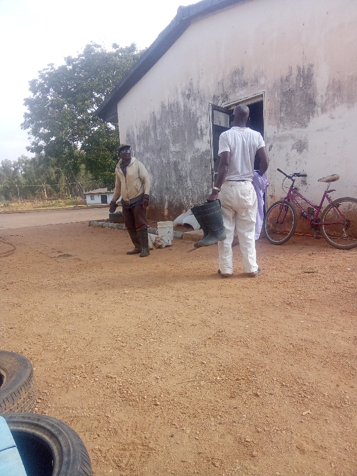 The scene depicts an outdoor area in Bar Jirgi Summa, Nigeria, featuring a single-story, light-colored building with a dark roof and an open doorway on its right side. The building's exterior walls show significant staining and discoloration. The ground consists of reddish-brown dirt or sand. Two adult males and one partially visible individual are present. One male, positioned on the left, wears a light-colored jacket, dark trousers, dark boots, and a dark cap; he is looking towards the left. A second male, positioned near the doorway and seen from behind, wears a white t-shirt and light-colored trousers, holding a pair of dark rubber boots in his left hand. He faces the open doorway. Partially visible inside the doorway, behind the second male, is an individual in light purple clothing. To the right of the doorway, a purple bicycle with a brown seat is parked, leaning against the building. Near the male on the left, several white containers or bags are on the ground. In the bottom left foreground, two vehicle tires are partially visible. A large tree with green foliage stands in the background behind the building, with additional sparse vegetation and a small, distant structure also visible. The sky appears bright or overcast.