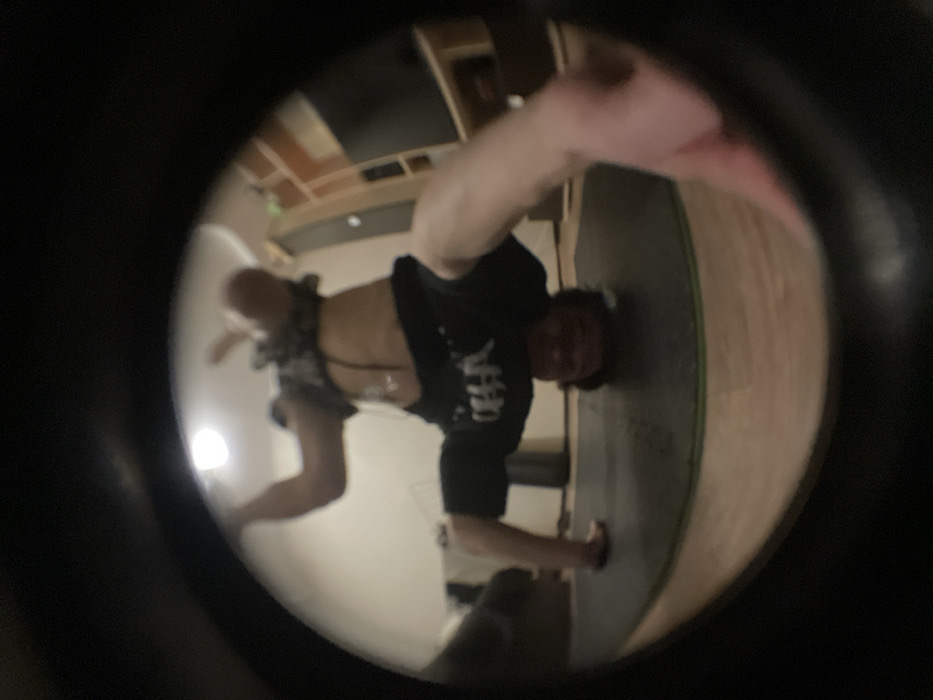 A person performs a headstand on a green mat, as viewed through a fisheye lens. They wear a black t-shirt and shorts with a patterned top. The background reveals a room with light walls, wood paneling near the ceiling, and a glimpse of furniture. The fisheye effect distorts the perspective, creating a circular frame and exaggerating the angles.