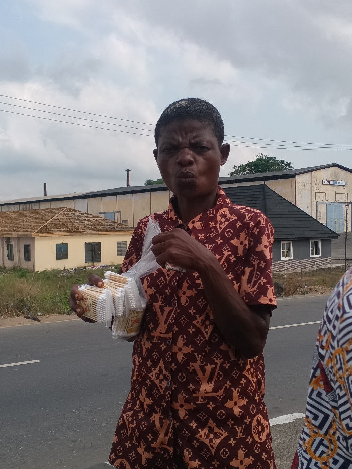 The image depicts a roadside scene in Owerri, Nigeria, featuring a primary human subject and background structures under an overcast sky