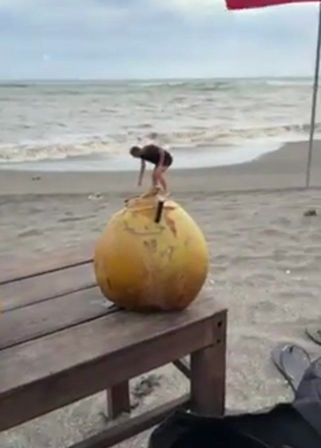 person relaxing on a beach with two open coconuts on a small wooden table