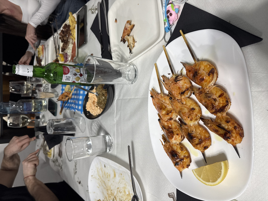 The image depicts an indoor dining scene at a restaurant in Sliven, Bulgaria, with a white tablecloth covering the table. In the foreground, a white rectangular platter holds eight grilled shrimp skewers, arranged in two rows, with a lemon wedge on the left. Adjacent to this, a white rectangular plate contains discarded shrimp heads and tails. On the table, from left to right, a white plate with food remnants and a fork is visible. A clear glass tumbler contains water. A person's left arm and hand are visible on the far left, wearing a black shirt and a red bracelet on the wrist, using a knife and fork to cut food on a white plate. In the mid-ground, a black bowl holds two different dips (one orange, one dark green) with a spoon. A green glass beer bottle, partially consumed, stands upright next to an empty clear glass tumbler. Further right, a white plate contains a meal of grilled meat, french fries, and a small salad. A dark-colored mobile phone is present on the tablecloth. A white-clad arm of another person is visible on the far right, engaged in eating. The table also features several wine glasses, some containing white wine, and a clear glass water carafe. A blue and white checkered napkin or cloth is folded on the table, and a collection of toothpicks is visible near the center. The general ambiance suggests an evening meal.