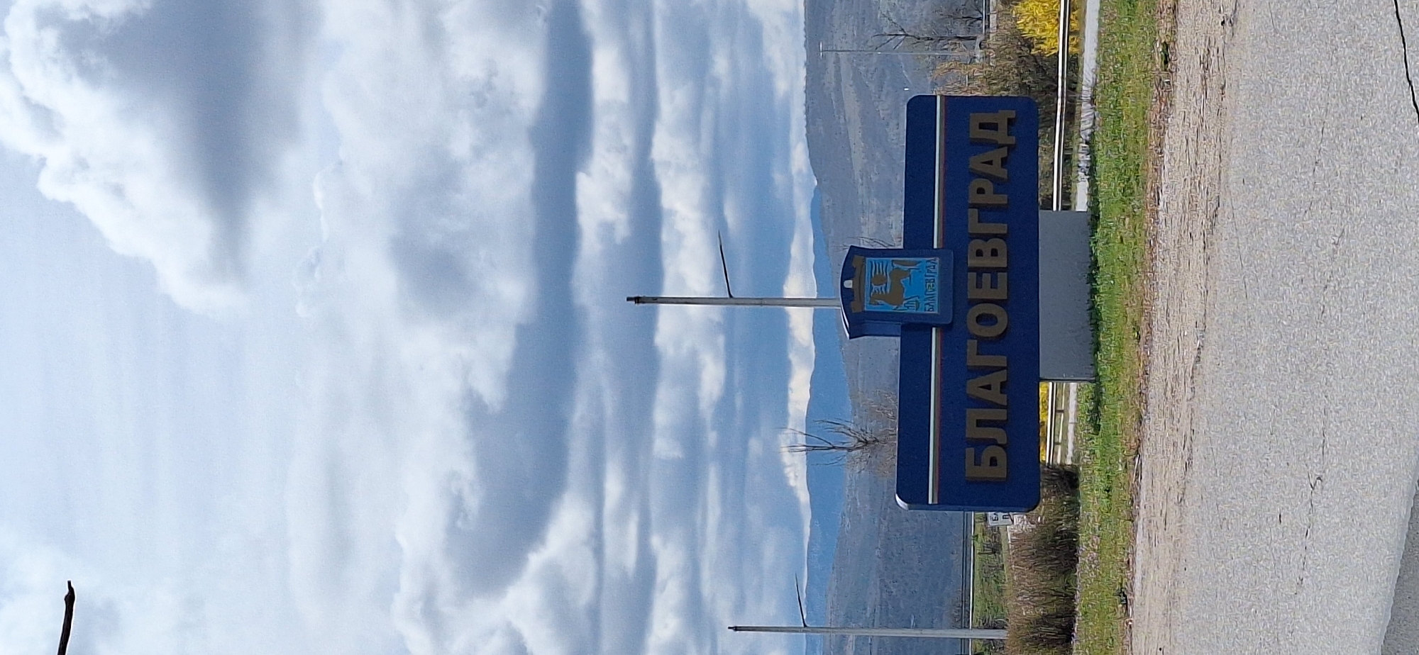 blue sign that reads "БЛАГОЕВГРАД" in Bulgarian, indicating the entrance to the city of Blagoevgrad, Bulgaria