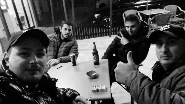 A grayscale photograph depicts four adult males seated around a square table on an outdoor terrace in Senec, Slovakia. The scene is artificially lit, suggesting an evening or nighttime setting. **Individuals:** 1. **Left foreground:** A male subject, wearing a dark baseball cap and a dark, reflective puffer jacket, holds a lit cigarette between the fingers of his left hand and looks directly at the camera. 2. **Left middle:** A male subject with a beard, wearing a dark puffer jacket, is seated with a cigarette held between the fingers of his right hand and looks towards the camera. 3. **Right middle:** A male subject with short hair, wearing a dark jacket, forms a V-sign (peace sign) with his right hand and looks towards the camera. 4. **Right foreground:** A male subject, wearing a dark baseball cap with an 'NY' logo and a dark jacket, extends his right thumb upwards in a 'thumbs-up' gesture and looks directly at the camera. **Table Contents:** The light-colored square table holds one black Coca-Cola branded beverage can, one brown glass beer bottle with its cap removed positioned beside it, a metallic ashtray containing multiple cigarette butts, one pack of cigarettes with white and red packaging, and a small metallic object, likely a lighter. **Environment:** The background features a dark, vertically slatted fence. Behind the fence, a dark colored vehicle, possibly an SUV or van, is visible. Multiple additional unoccupied outdoor tables and chairs are present in the deeper background. The setting is an outdoor seating area, indicative of a commercial establishment.