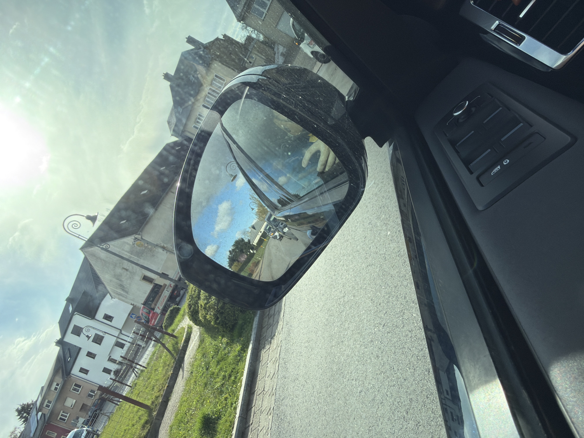 The image displays a daytime view from inside a vehicle on a residential street in Reckange-sur-Mess, Luxembourg, under bright, sunny conditions. The foreground is dominated by the interior of a dark-colored vehicle, showcasing a dusty passenger-side exterior mirror, a section of the dark door panel, and a portion of the dashboard with chrome-accented air vents and various control buttons. The mirror's reflection shows a clear blue sky with white clouds, and the left hand of an individual, likely a passenger or driver, holding a black smartphone. Behind the reflected hand, a road recedes, with a white van and other vehicles visible. To the left and forward of the vehicle, an asphalt road runs parallel to a paved sidewalk and a grassy area enclosed by a fence constructed from wooden posts and wire. Beyond this, a red pickup truck, partially visible and bearing "COZZARELLI" branding, is situated on the road. A blue rectangular road sign, depicting a left-pointing arrow, is also present. The background features a cluster of diverse residential buildings, some appearing older with distinct architectural styles, while others are more modern, including one with rooftop solar panels. Several black, ornate streetlights with spiral finials are positioned along the street.