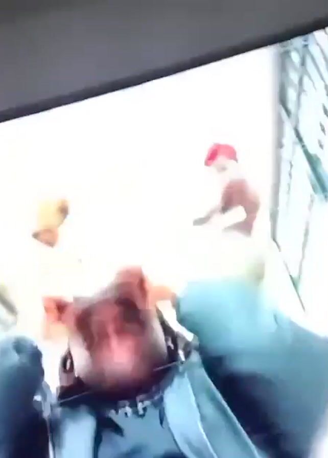 TV screen displaying a music video. The artist is a large, dark-skinned man wearing various outfits, including a black and yellow jacket, a Chicago White Sox baseball cap, and a red jacket. He is seen in different locations, including a room with a collection of objects, a staircase with two women in the background, a room with a checkered floor, and a space with a blue background and fireworks. The video is being filmed from a close-up perspective of the TV screen.