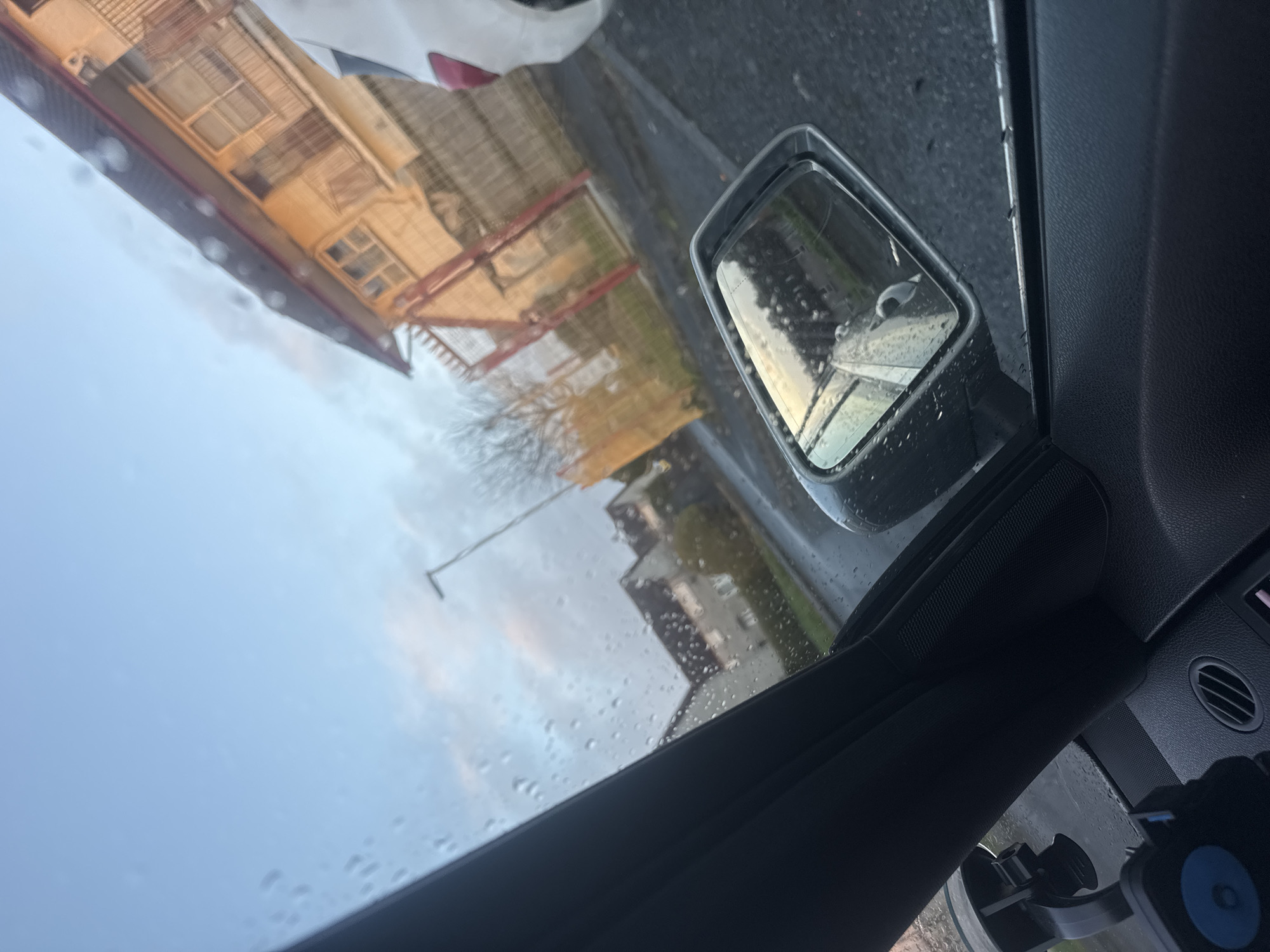 The image depicts a rainy day scene viewed from inside a car, likely parked or stationary, in the city of Armagh, United Kingdom. Raindrops are visible on the car's windshield and side mirror. Through the windshield, one can see a street, houses, and an overcast sky. The side mirror reflects a partial view of the street and buildings. The interior of the car features the dashboard, air vent, and a phone mount. The scene is static, with no apparent action or interaction taking place. No people are visible.