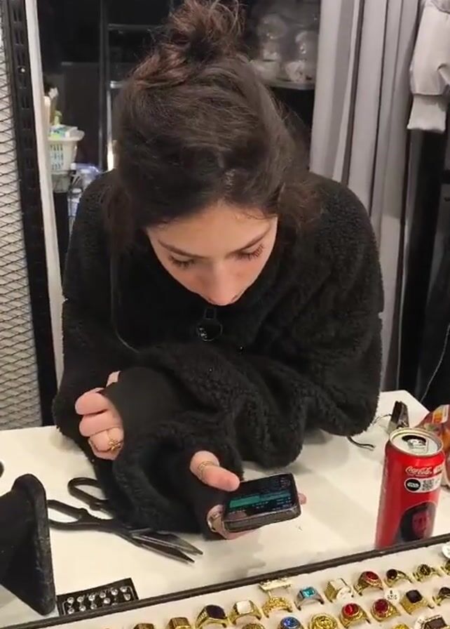 young woman looking at her phone while standing behind a counter covered in rings. The counter also holds scissors, a soft case, and a can of soda. In the background is a shelf and clothing rack with a variety of garments. The camera briefly moves away from the counter and pans over to the woman sitting on a stool in front of the clothing rack. She is still looking at her phone.