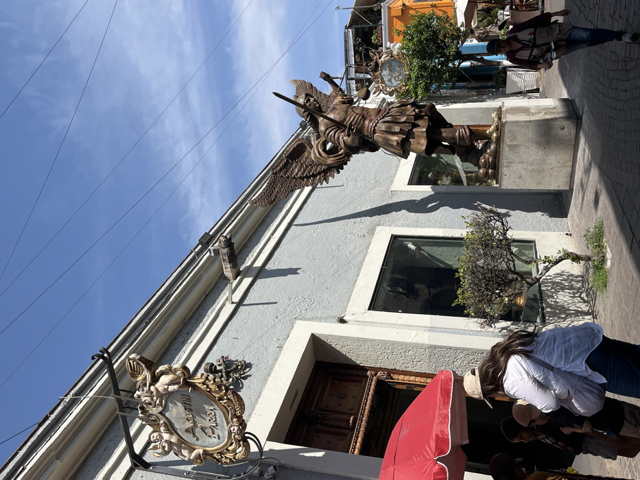 A building stands under a blue sky with thin clouds. It features a bronze statue of an angel holding a sword, mounted above a window. Below the window is an ornate gold-framed sign reading "Artessin Pasta" and a decorated wooden door. A red umbrella partially covers the doorway. People walk along the sidewalk next to the building. Another window is visible along the street. Overhead power lines run parallel to the roofline.