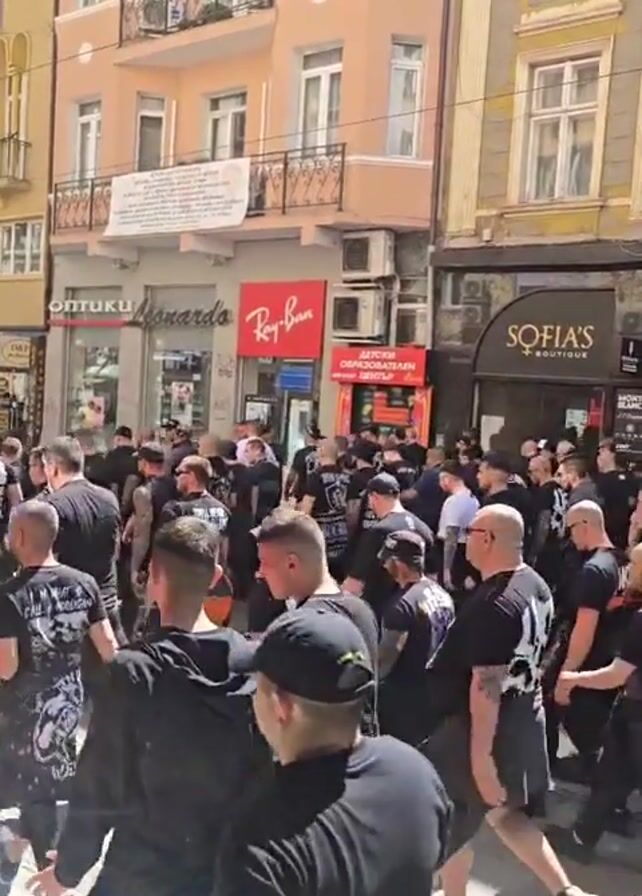 A large group of men are walking down a city street. Most of them are wearing black t-shirts and black caps. Some of the t-shirts have skull designs on the back. The men are walking past shops and buildings, including a Ray-Ban store and a boutique called “Sofia’s.” There are police barriers visible in the lower left of the frame. The overall impression is of a march or demonstration.