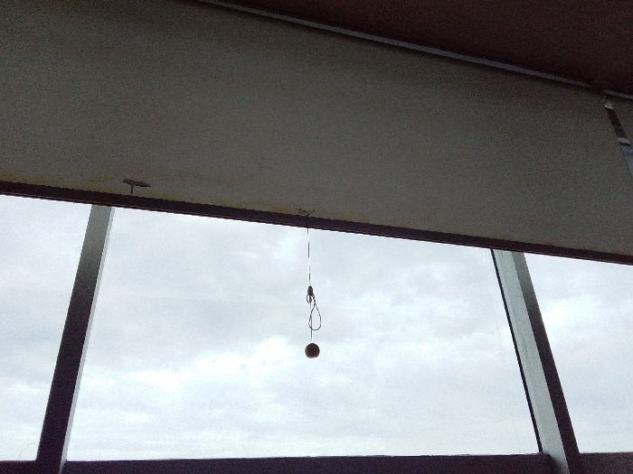 A mostly closed window shade hangs against a window. The shade is worn and slightly stained. The window frame is dark and contrasts with the cloudy sky outside. A string hangs down from the middle of the shade, ending with a small, round object that appears to be made of wood. The window appears to be partially open to allow the string to hang down.